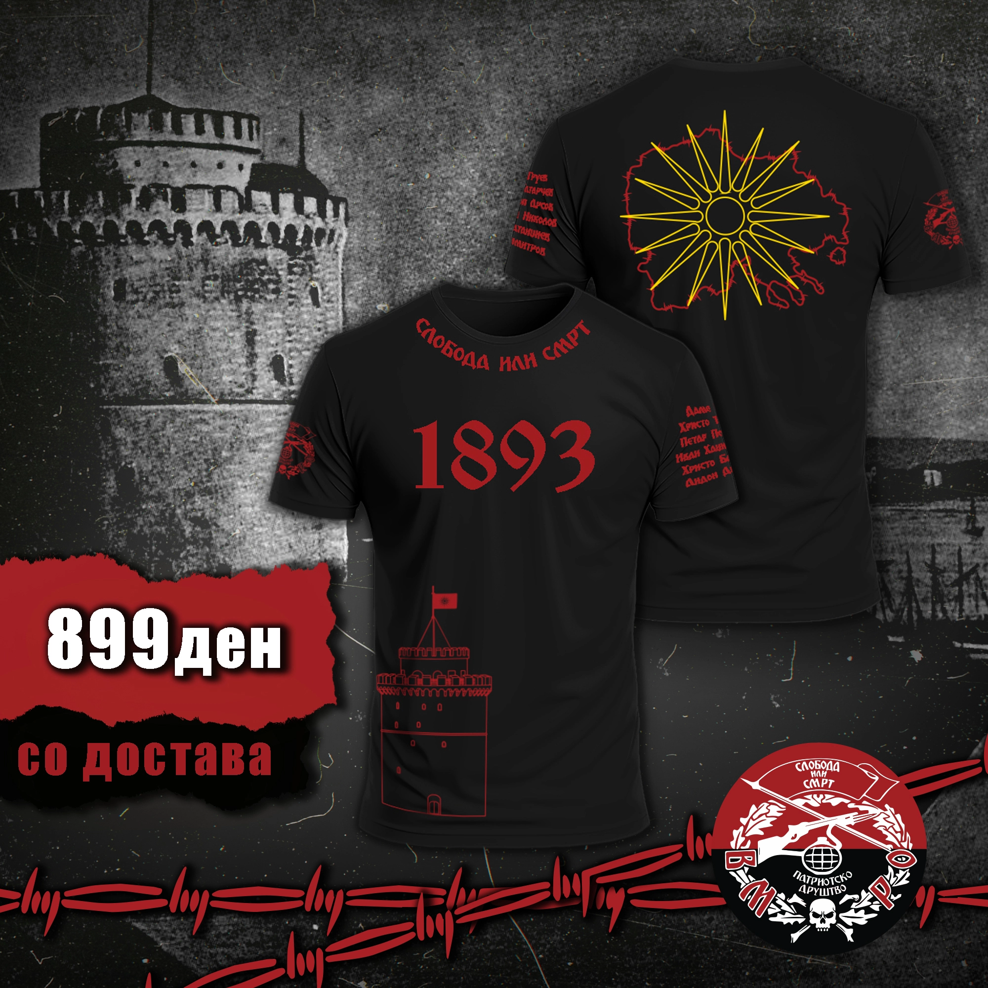 Маица 1893 – идеална маица за сите патриоти на кои тренингот е дел од секојдневниот живот. Маицата е направена од стреч материјал, погоден за секој вид на тренинг или спорт. На маицата квалитетно се испечатени повеќе симболи и слики поврзани со Македонија: „Слобода или Смрт“, Белата кула, карта на Обединета Македонија со сонцето од Кутлеш, амблемот на ТМОРО и имињата на нејзините основачи.
