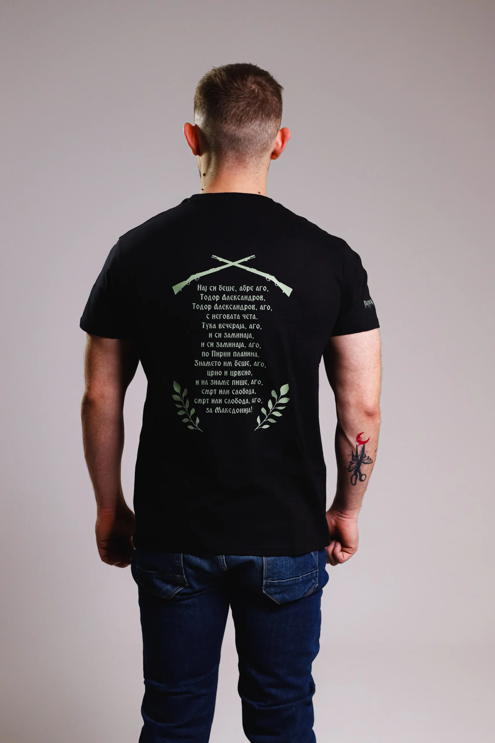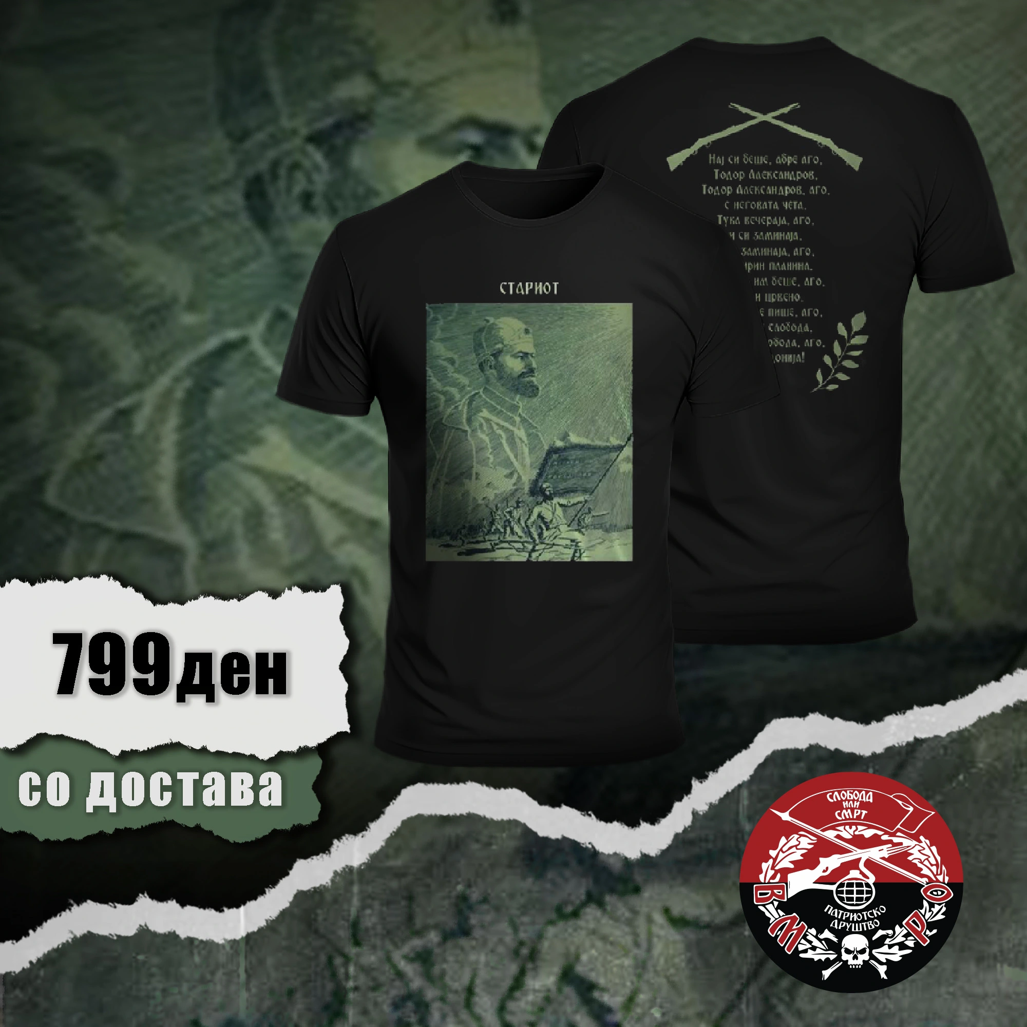 Поминаа повеќе од 100 години од смртта на Тодор Александров, еден од најголемите великани на македонското револуционерно движење. Александров од најрана возраст бил дел од МРО, а подоцна се издвоил и станал нејзин водач. Тој бил сметан за легенда уште дури бил жив, а неговата прерана смрт само го зацементирала неговото место во пантеонот македонски великани. Маицата е направена во негова чест, да оддаде почит на неговото дело и да биде вечен спомен за „Стариот“.