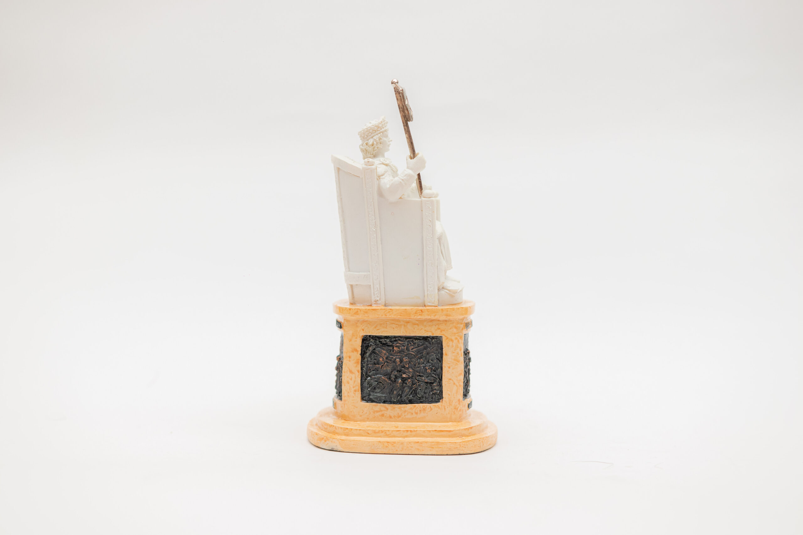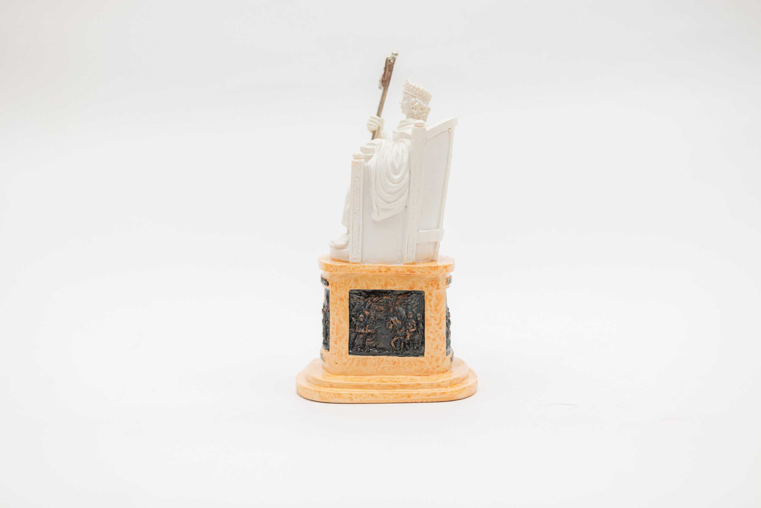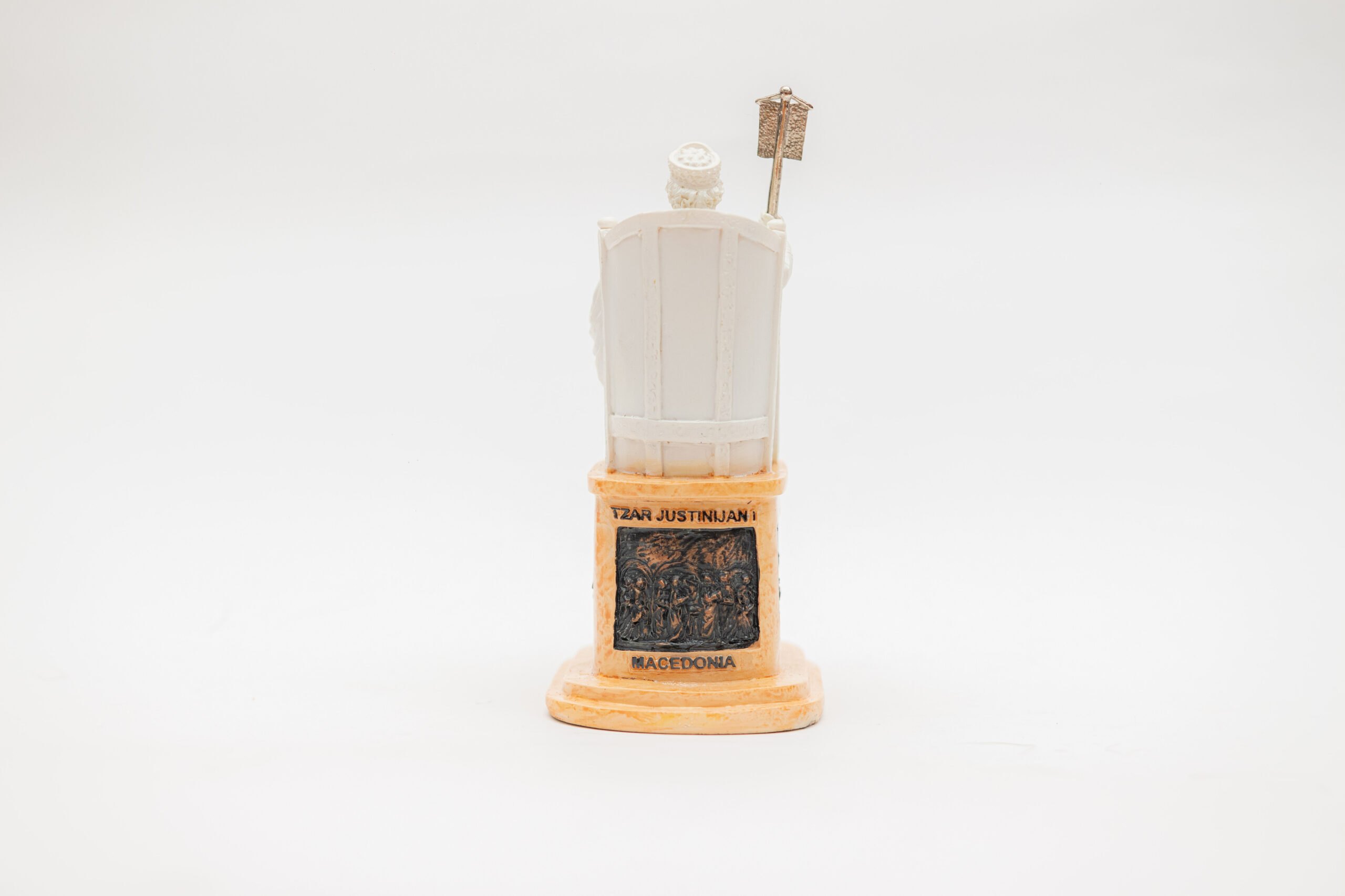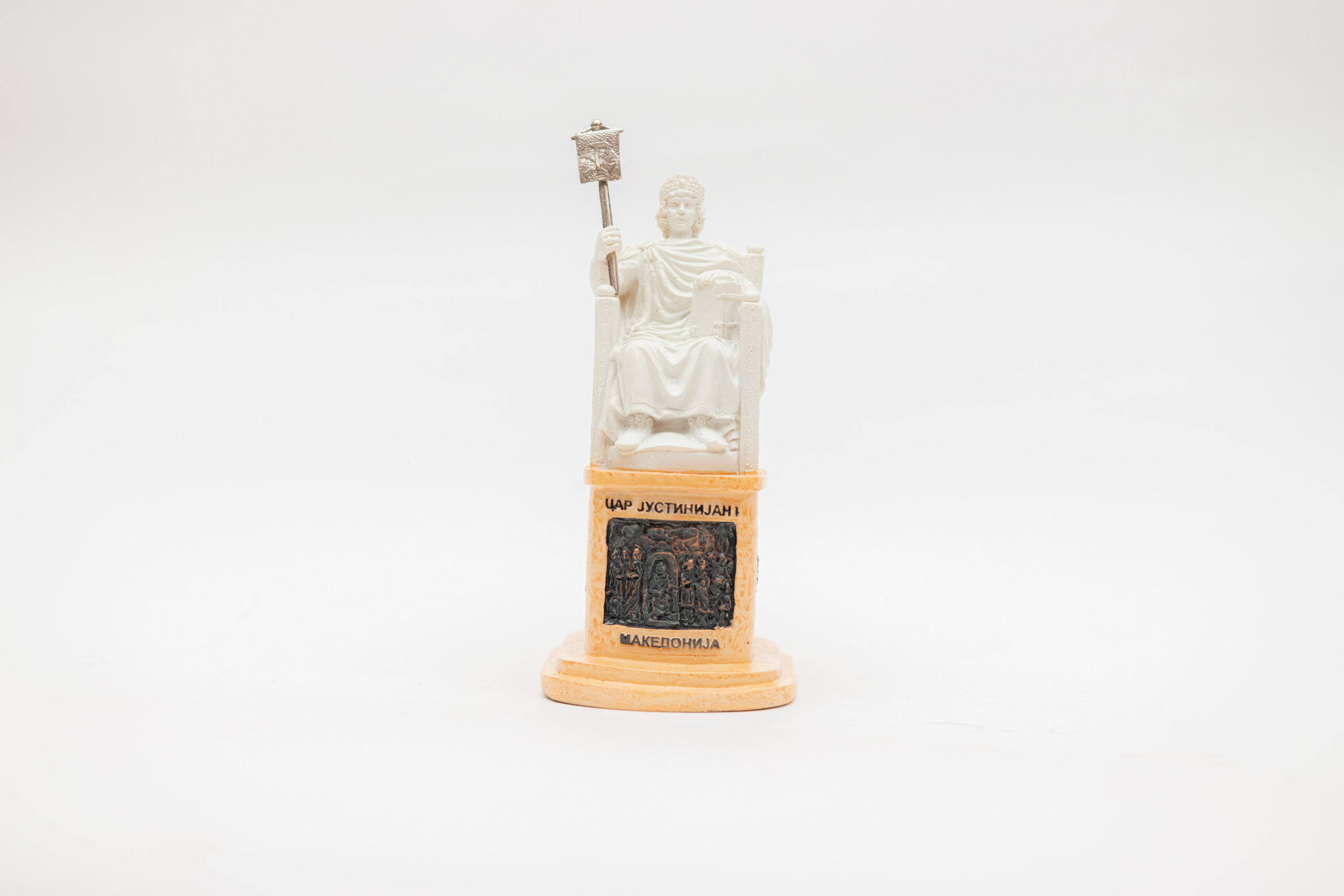 Прецизно изработена минијатура посветена на Јустинијан Први – симбол на византиската моќ и правото. Совршен украс за љубители на историјата и класичната уметност.